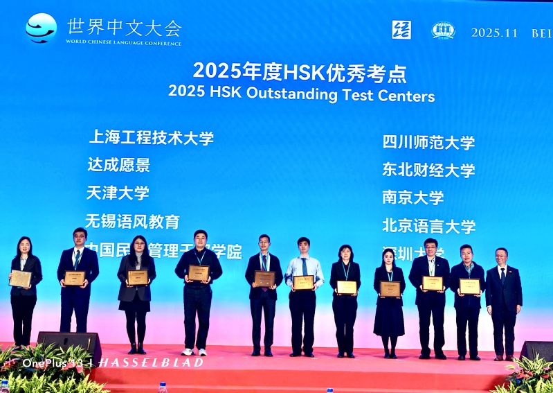 在国际中文教育蓬勃发展的背景下,2025年11月14日—16日,于北京国家会议中心举办的世界中文大会备受全球瞩目。大会期间,汉考国际举行了“中文水平考试(HSK)全球合作伙伴大会”及年度颁奖典礼,对全球范围内在中文考试推广与服务保障方面表现突出的机构予以表彰。凭借在考务组织、服务质量与品牌建设方面的持续提升,我校再次从众多单位中脱颖而出,成功蝉联“2025年度HSK优秀考点”称号。