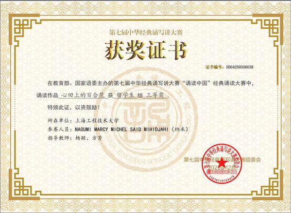 获奖作品由我校国际学生NAOUMI MARCY MICHEL SAID MIHIDJAHI(中文名:纳米)同学朗诵完成。她的演绎不仅准确把握了作品《心田上的百合花》中所蕴含的坚定信念与奋斗精神,更以真挚饱满的情感超越了语言与文化的差异,深深打动了大赛评委。
