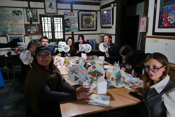 非遗体验环节在农民画村展开。浓郁质朴、色彩鲜明的农民画充满生活气息。国际学生在画家指导下亲手执笔创作,切身感受中国民间艺术的感染力,沉浸在乡村生活的质朴画面之中。